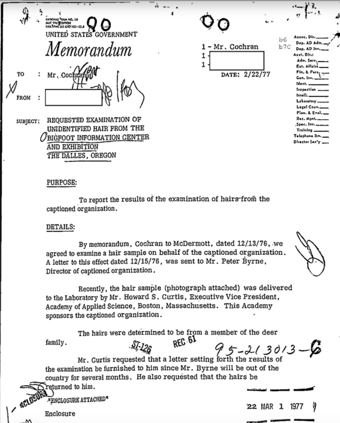 And one final Bigfoot tidbit. Earlier this year, the FBI unsealed its files on Bigfoot. (Yes! The FBI had Bigfoot files which they had been keeping secret for over 40 years.) Bigfoot devotees had long claimed that fur samples had been taken by government officials from a Bigfoot sighting and sent to a lab for testing to determine exactly what type of animal Bigfoot was.